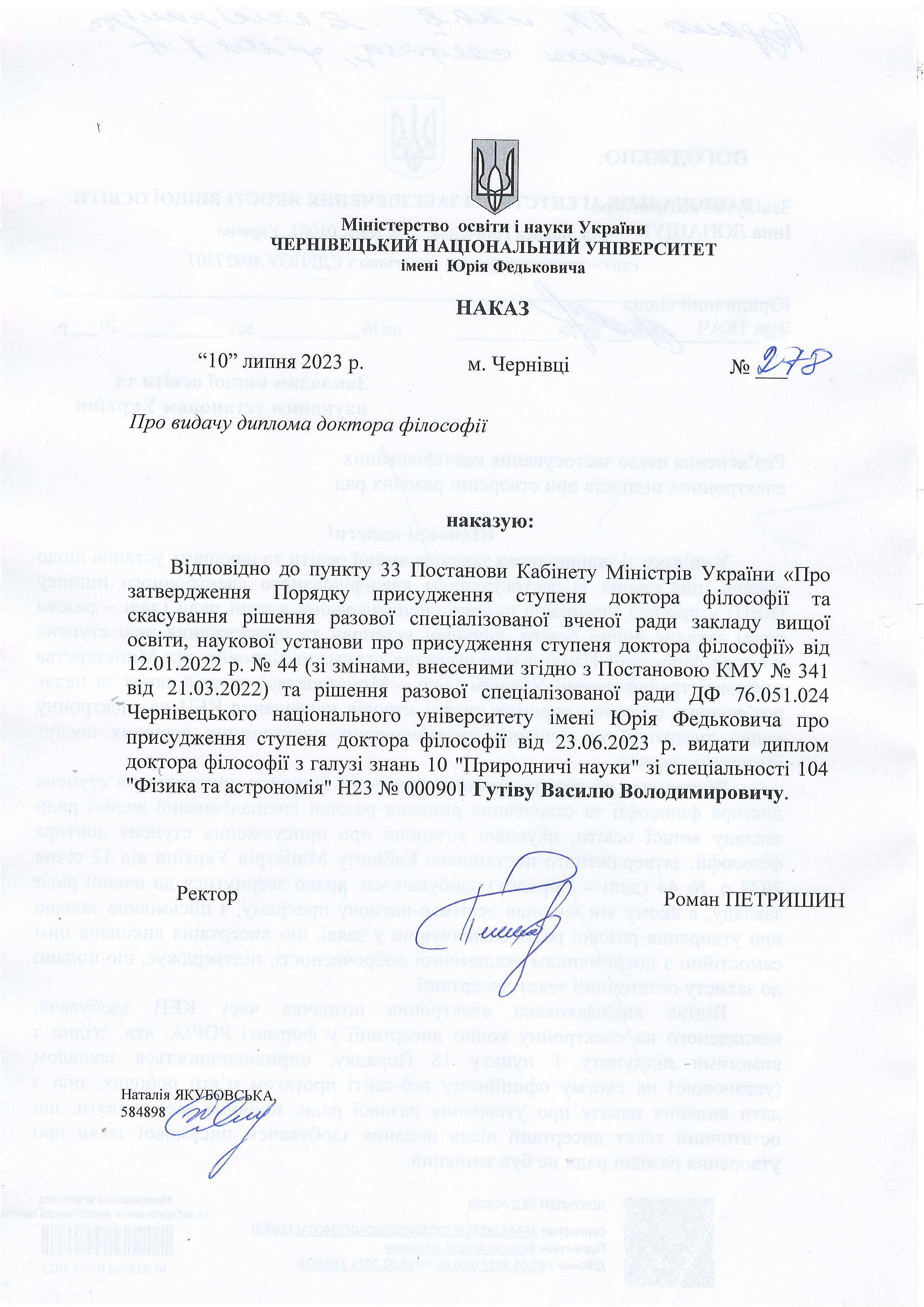 Наказ ректора Чернівецького національного університету імені Юрія Федьковича «Про видачу диплома доктора філософії».